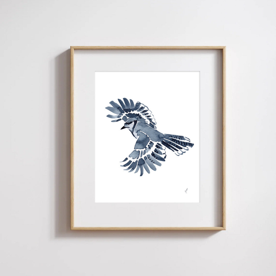 Painted in watercolour, this blue jay mid-flight captures a fleeting moment of brightness – a flash of vibrant blue moving through the stillness of the woods.